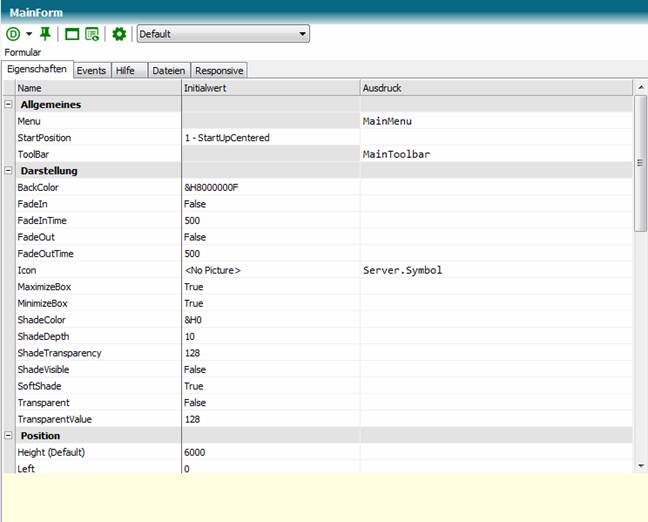 In der Spalte Initialwert wird der Standardwert der Eigenschaften eingestellt. Manche Eigenschaften wie Menü oder Toolbar können nur einen Wert zur Laufzeit annehmen. Daher sind die Initialfelder dieser Eigenschaften ausgegraut.