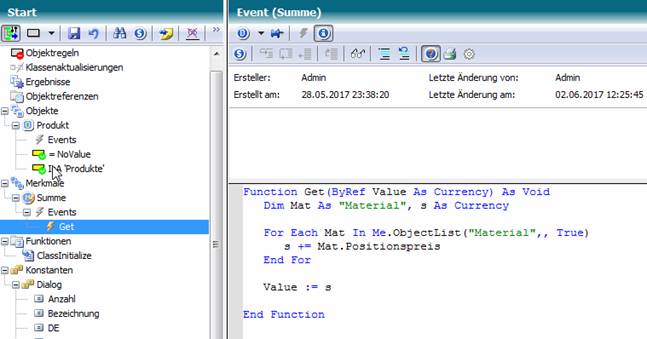 Since the total value of the material is now the [Position price] feature, the Get Event of the Total feature in the Start class must be adjusted: