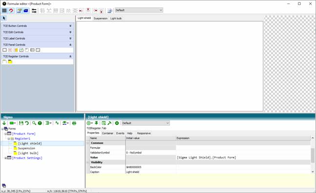 In this realization of the tutorial we have decided on a register to display the many possible objects of the products scalable on a form. A complete implementation of a register consists of a register control and one or many tab controls, defined as child controls of the register control.
