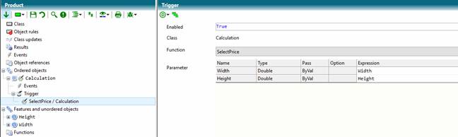 Triggers are ideal for enabling this functionality. In the Calculation class, you create a trigger function that carries out pricing depending on the transferred width and height.